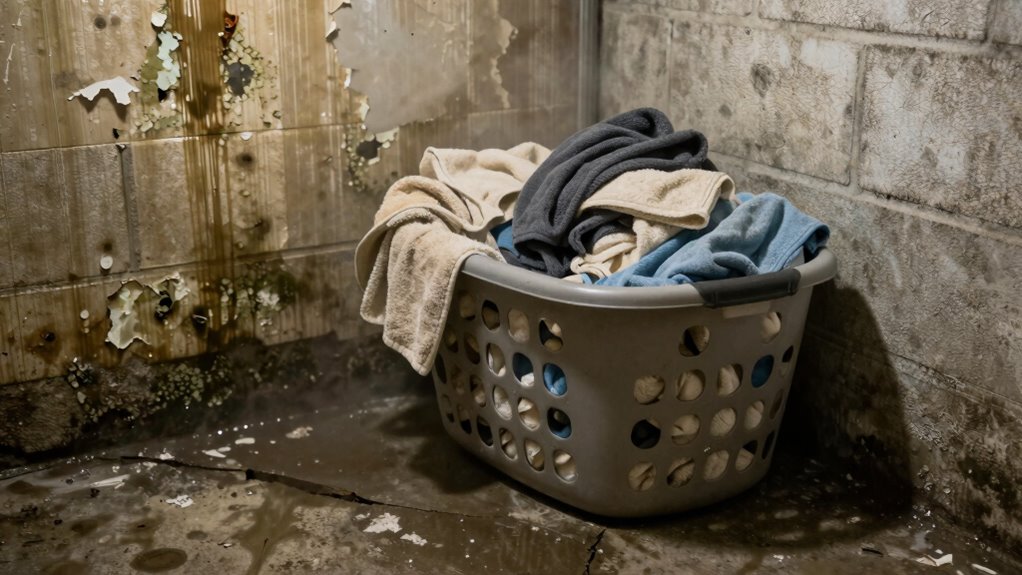 Musty smells often originate in specific areas of your home where moisture tends to accumulate or ventilation is inadequate. Basements are common trouble spots, especially if you have basement leaks that allow water to seep in. These leaks create a damp environment perfect for mold growth and odors. Similarly, your attic can develop musty smells if attic ventilation isn’t sufficient, trapping warm, moist air that encourages mold and mildew. Poor airflow in these areas prevents moisture from escaping, causing odors to linger. Regularly inspect your basement for leaks and ensure your attic ventilation is working properly. Proper ventilation techniques can help reduce moisture buildup and prevent musty odors from forming. Addressing these issues promptly can considerably reduce musty smells and prevent mold from taking hold in hidden corners of your home. Considering humidity levels and maintaining a healthy indoor environment can also make a significant difference. Using indoor air quality gear like HEPA filters and UV-C sterilizers can further improve air circulation and reduce mold spores. Additionally, paying attention to air circulation patterns throughout your home can help identify areas where stale, damp air may be accumulating and contribute to musty odors. Maintaining optimal ventilation strategies can be essential in controlling indoor moisture and odor issues.
