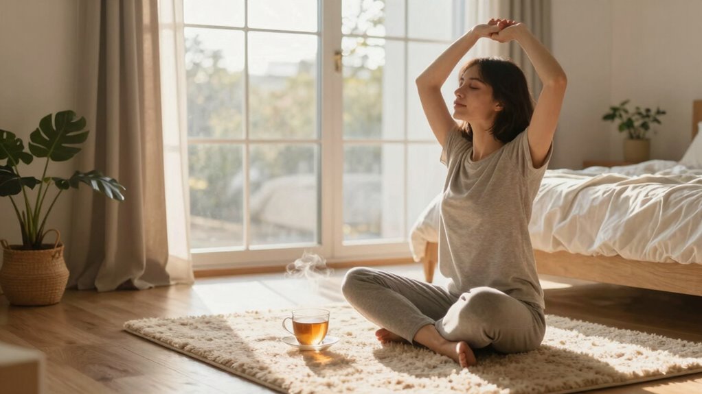Start your day by getting 10-15 minutes of natural sunlight to boost your mood and set your circadian rhythm. Incorporate gentle movement or stretching to energize your body, followed by hydration and a nourishing breakfast to stabilize your energy. Create a cozy, distraction-free space with warm lighting and personal touches. Consistently combining light, movement, and self-care makes mornings smoother and more uplifting. Keep exploring for simple tips to make this routine effortless and sustainable every day.