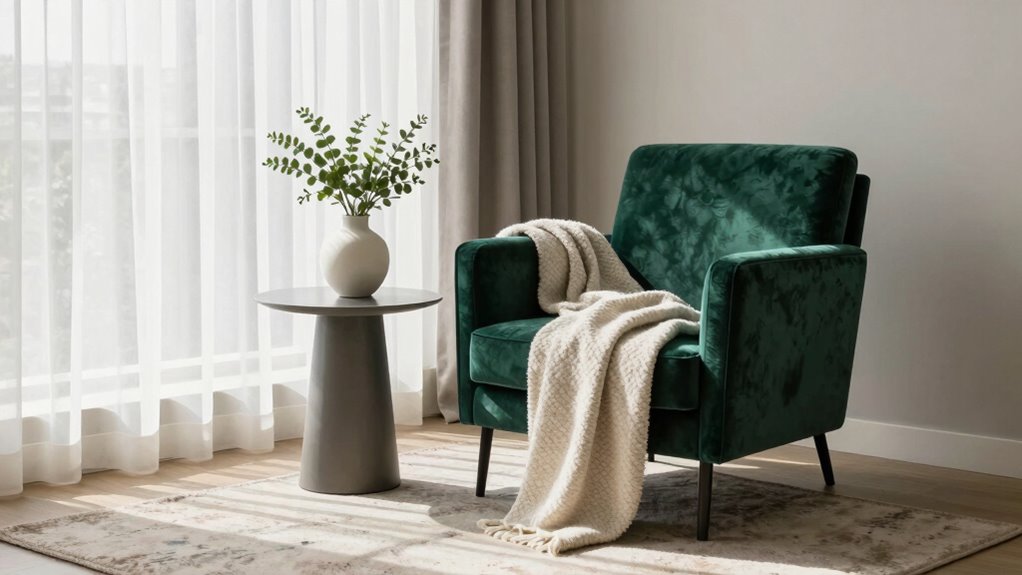 Studies show that neutral and deep hues elevate a space’s luxury vibe. You should use color psychology to choose calming, sophisticated shades like navy, charcoal, or beige. Pair these with strategic lighting techniques—warm, layered lighting enhances richness and comfort. Avoid overly bright or cold colors, which can diminish the luxurious feel. By combining rich colors with thoughtful lighting, your comfort corner instantly feels more upscale and inviting.