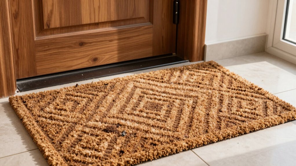 When you notice signs of wear on your entryway mat, it’s time to contemplate replacing it to maintain its effectiveness. Over time, material durability diminishes due to constant foot traffic and exposure to dirt and moisture. If the mat becomes frayed, torn, or starts curling at the edges, its ability to trap dirt declines. Additionally, a worn-out mat can look unsightly, so consider aesthetic options that match your entryway decor. Regularly check for signs of deterioration, and don’t hesitate to upgrade when necessary. A new, durable mat with appealing design can refresh your entryway’s look while maintaining its functional purpose. Material durability is also a helpful factor to consider when evaluating the longevity of your entryway mat. Proper maintenance and cleaning can further prolong the life of your entryway mat and keep it looking its best.