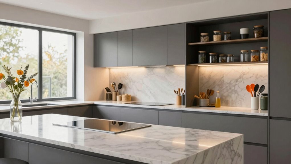 You should position each zone based on your workflow, placing the prep area near ergonomic seating for comfort and easy access. Keep the cooking zone close to the stove and oven, and the cleanup area near the sink. Incorporate decorative accents to define each space visually, making the layout inviting. Make certain each zone is functional and flows naturally, minimizing movement and making cooking effortless.