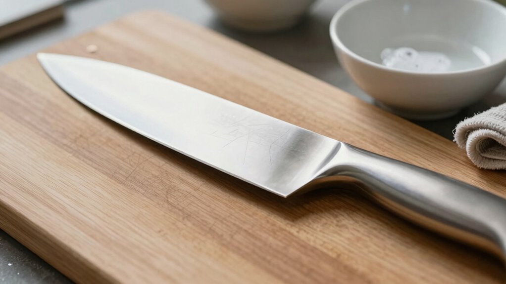 Ever wondered how to guarantee your knives stay clean and corrosion-free? Proper cleaning techniques are key. Always wash your knife soon after use with warm, soapy water, avoiding abrasive scrubbers that can damage the blade alignment or scratch handle materials like wood or plastic. Use a soft sponge or cloth to gently remove debris, paying special attention to the bolster area where grime can accumulate. Dry your knife immediately with a clean towel to prevent rust and corrosion. Never put your knives in the dishwasher, as harsh detergents and high heat can loosen blade alignment and degrade handle materials. Regular, careful cleaning preserves both the sharpness and integrity of your knives, ensuring they stay in top condition for years to come.