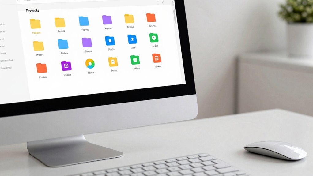 Once you’ve established consistent naming conventions, organizing your files by categories and projects helps keep everything accessible. Digital categorization creates a clear folder taxonomy that streamlines your workflow. Start by grouping related files into broad categories, such as Work, Personal, or Finances. Within each category, create subfolders for specific projects or topics, like “Q2 Reports” or “Vacation Planning.” This structure helps you find files quickly and reduces clutter. By maintaining a logical folder taxonomy, you’ll avoid the chaos of scattered files. Remember to regularly review and refine your categories as projects evolve. Clear categories and thoughtful organization make your digital space intuitive, saving time and frustration whenever you need a file. consistent naming conventions help reinforce your folder structure and improve overall file retrieval.