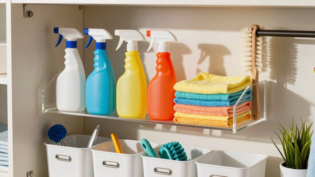 To make certain your cleaning supplies are used regularly, it’s crucial to set up a central location that’s easily accessible and well-organized. Consider these steps: