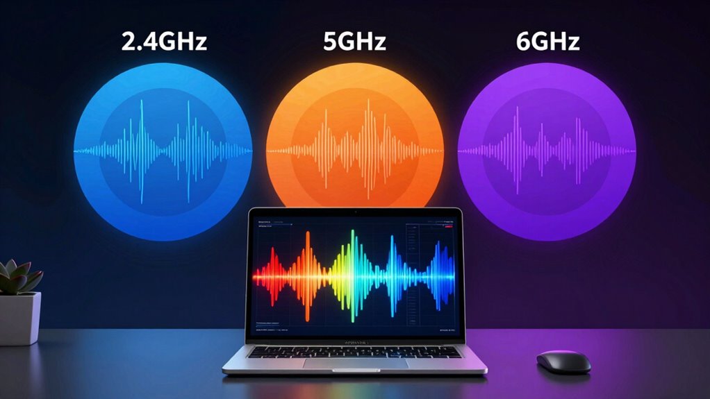 You’ll find minimal security differences between 2.4GHz, 5GHz, and 6GHz bands, but encryption standards matter. All bands support WPA3, which offers strong protection against network vulnerabilities. However, 2.4GHz networks are often more vulnerable due to longer range and congestion, making them slightly more susceptible to attacks. To stay secure, verify your router uses the latest encryption and avoid outdated protocols regardless of the band.