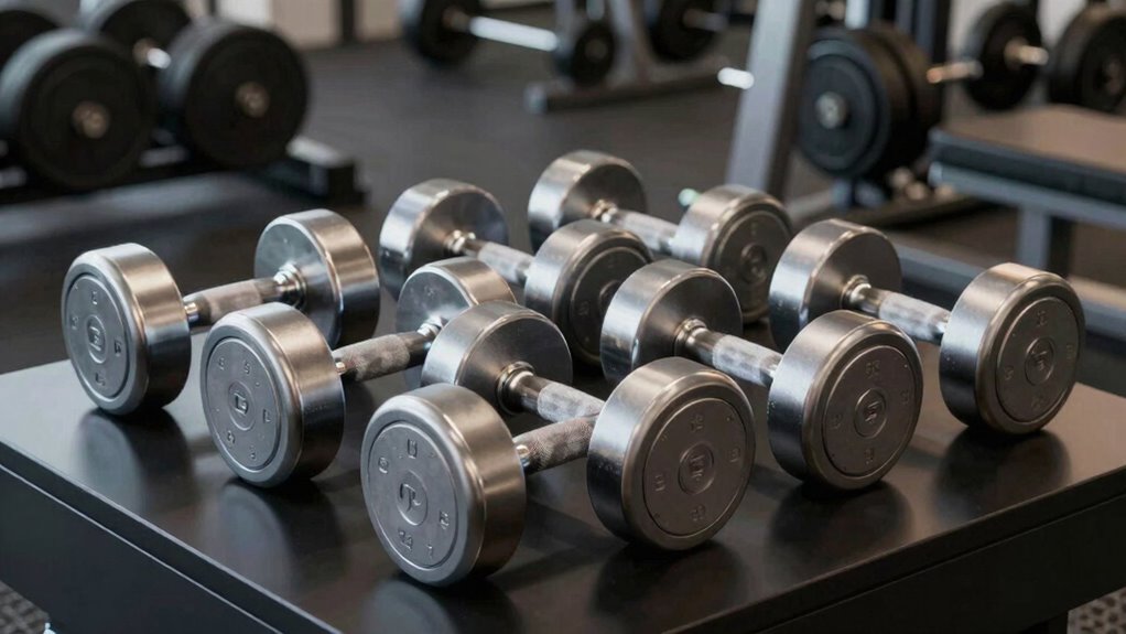 High-end adjustable dumbbells often feature safety mechanisms that feel like having a secret handshake. They include secure locking systems, anti-slip grips, and quick-release pins that prevent accidental weight shifts. Some even have electronic safety locks for added security. These features work together to guarantee your workout is safe and smooth, giving you confidence as you push your limits. It’s like having a personal bodyguard for your fitness journey.