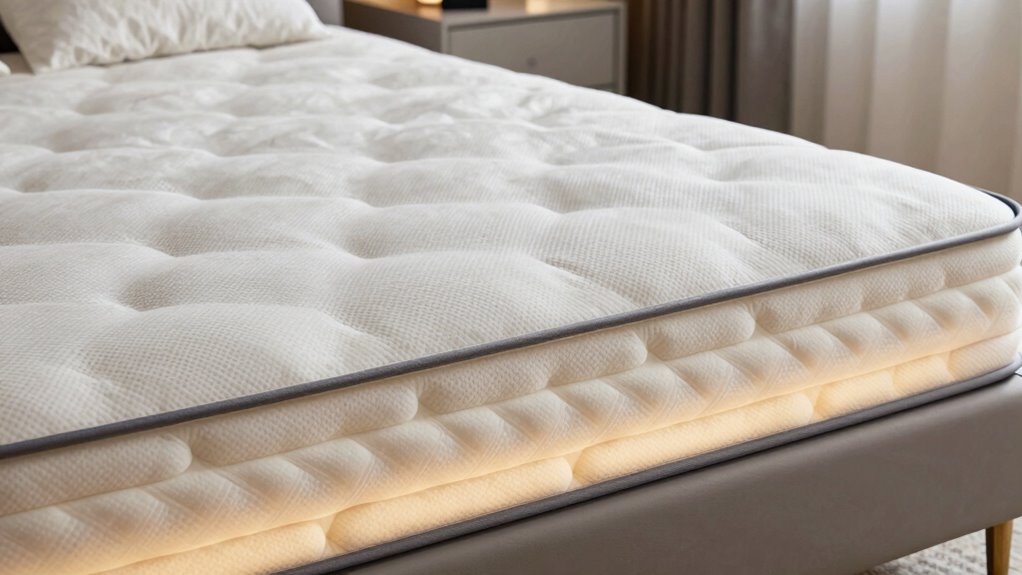 Choosing a latex mattress for hot sleepers hinges considerably on its breathability, which directly impacts thermal comfort throughout the night. Latex with open-cell structures promotes better airflow, helping to dissipate heat and keep the surface cool. Honeycomb pore designs enhance ventilation, allowing heat and moisture to escape more efficiently. Talalay latex generally offers higher airflow compared to Dunlop latex, aiding in temperature regulation. Natural latex‘s inherent breathability reduces heat retention, making it an ideal choice for hot sleepers. Layering techniques that include ventilated latex or cooling gels further boost breathability and thermal management. By prioritizing these material features, you can substantially improve your sleep environment and stay cooler throughout the night.