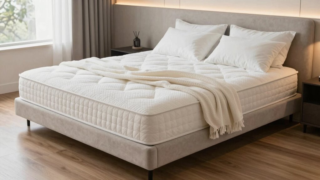 When evaluating a premium mattress in a box queen, motion isolation stands out as a key feature—especially if you share your bed. Good motion isolation means minimal transfer of movement, so you won’t be woke up by your partner’s tossing or turning. Effective options often use individually wrapped pocket coils or dense foam layers that absorb and reduce motion transfer. Hybrid mattresses, combining pocket springs with foam, tend to offer superior motion control compared to traditional innerspring or foam-only models. Reinforced edges and zoned support systems also help by preventing movement from spreading across the entire bed. When these features are well-designed, they considerably decrease sleep disruptions, allowing both partners to enjoy restful, undisturbed sleep throughout the night.