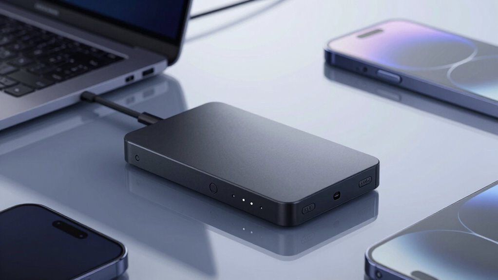 Selecting a portable SSD 4TB that seamlessly integrates with your devices hinges on understanding their connectivity options and compatibility features. Make certain the SSD supports the ports your devices use, such as USB-C, USB-A, Thunderbolt 4, or USB 3.2 Gen 2/2×2, for smooth connectivity. Check that it’s compatible with your operating system, whether Windows, macOS, Android, Linux, or iOS, to guarantee proper functionality. If you have specific needs, like iPhone ProRes 4K recording or gaming on a PS5 or Xbox, verify the SSD’s compatibility with those features. Additionally, confirm that its hardware interface and transfer protocols match your device’s capabilities for maximum data speeds. In the end, consider whether it offers management software or apps suited to your device for easy file handling and security.
