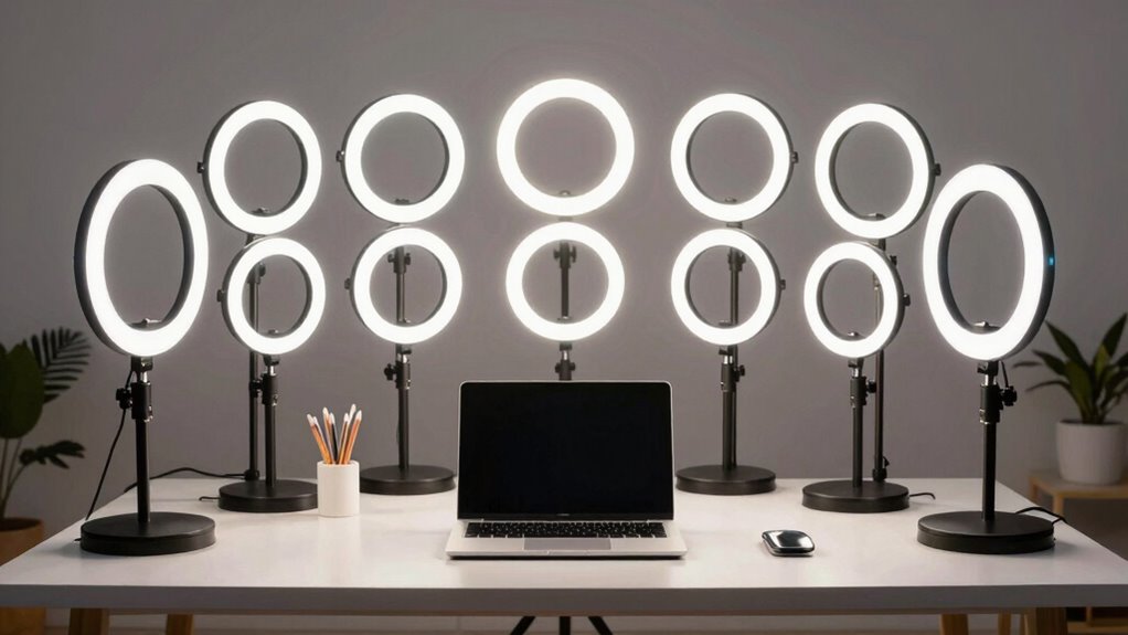 If you’re looking for the best premium ring lights for video calls in 2026, I’ve found top models that offer adjustable brightness, multiple color temperatures, and versatile mounting options. They’re lightweight, easy to set up, and provide professional-quality lighting, whether for streaming, work, or content creation. Many come with remote controls, rechargeable power, and foldable designs for on-the-go use. Keep exploring to discover the perfect lighting solution that suits your needs perfectly.