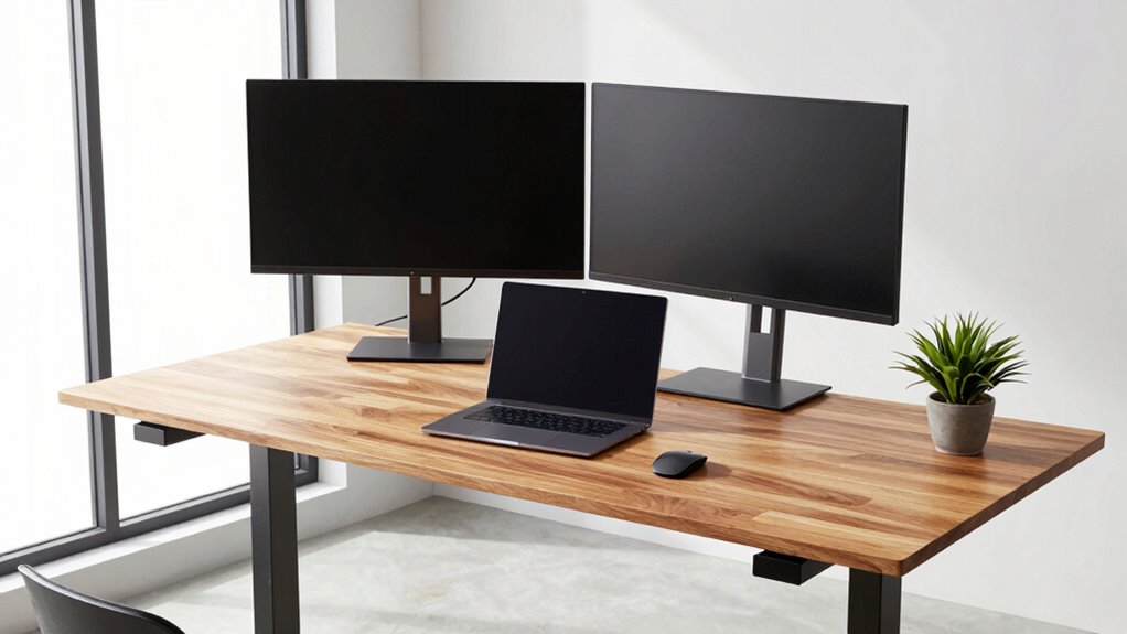 The maximum weight capacity for dual monitor setups varies, but most sturdy standing desks support between 50 to 100 pounds. I always check the manufacturer’s specifications before setting up my monitors to guarantee I don’t exceed the limit. It’s essential to distribute weight evenly and consider the weight of your monitors, stand, and any accessories. Staying within the specified capacity helps prevent damage and ensures stability.