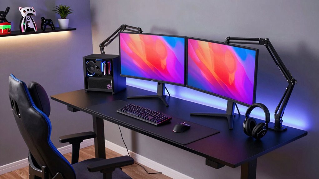Absolutely, standing desks can comfortably accommodate multiple monitors. I’ve found that desks with wide, spacious surfaces and sturdy frames make it easy to set up dual or even triple monitor configurations. Adjustable height features also help optimize viewing angles and ergonomics. Just guarantee the desk’s weight capacity is sufficient for your monitors and accessories. With the right setup, you’ll enjoy a more flexible, ergonomic gaming experience without sacrificing space or comfort.
