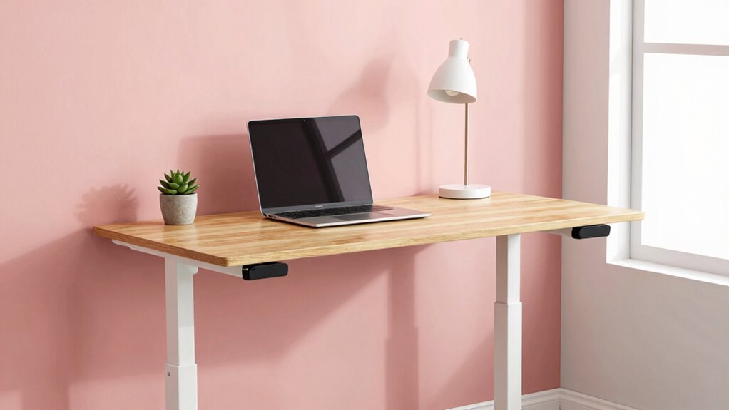 When selecting a standing desk for small spaces, stability and durability are essential factors that can’t be overlooked. A sturdy frame made from high-quality materials like industrial-grade steel guarantees the desk won’t wobble during daily use, even at full height. Reinforced support features, such as connecting frames and L-shaped stiffeners, help prevent tipping or wobbling, which is especially important in tight spaces. Durability can be gauged by the number of lift cycles a motor supports; models supporting at least 50,000 cycles tend to last longer. Additionally, a well-built desk maintains stability across height adjustments, providing a secure work surface. Using safety-tested, low-VOC, eco-friendly materials not only enhances durability but also assures safe, long-term use in small spaces.