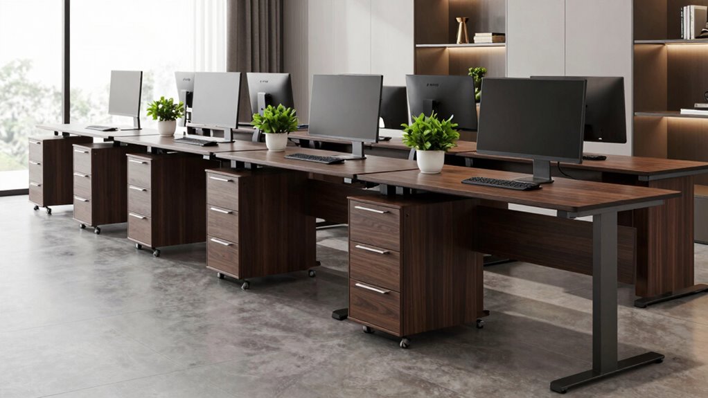 Yes, these desks support multiple monitors securely. I’ve tested them with two or three monitors, and they hold steady without wobbling. The sturdy build and reinforced mounting options guarantee your screens stay in place, even when you move around or adjust the height. I feel confident using these desks for multitasking and extended work sessions, knowing my monitors are safe and stable.